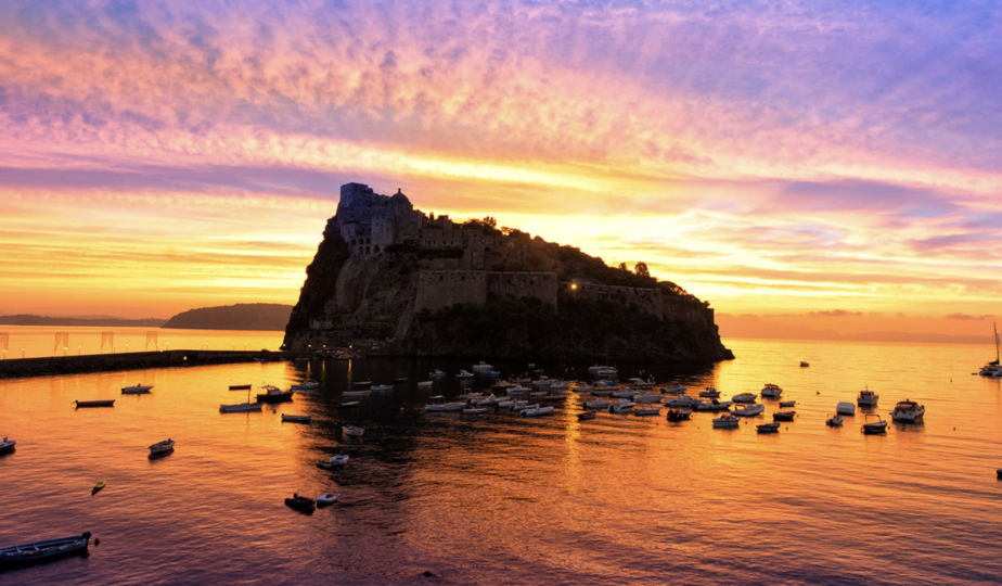 Quando da dietro al Castello Aragonese l’alba colora il cielo e il mare che abbracciano l’isola grande