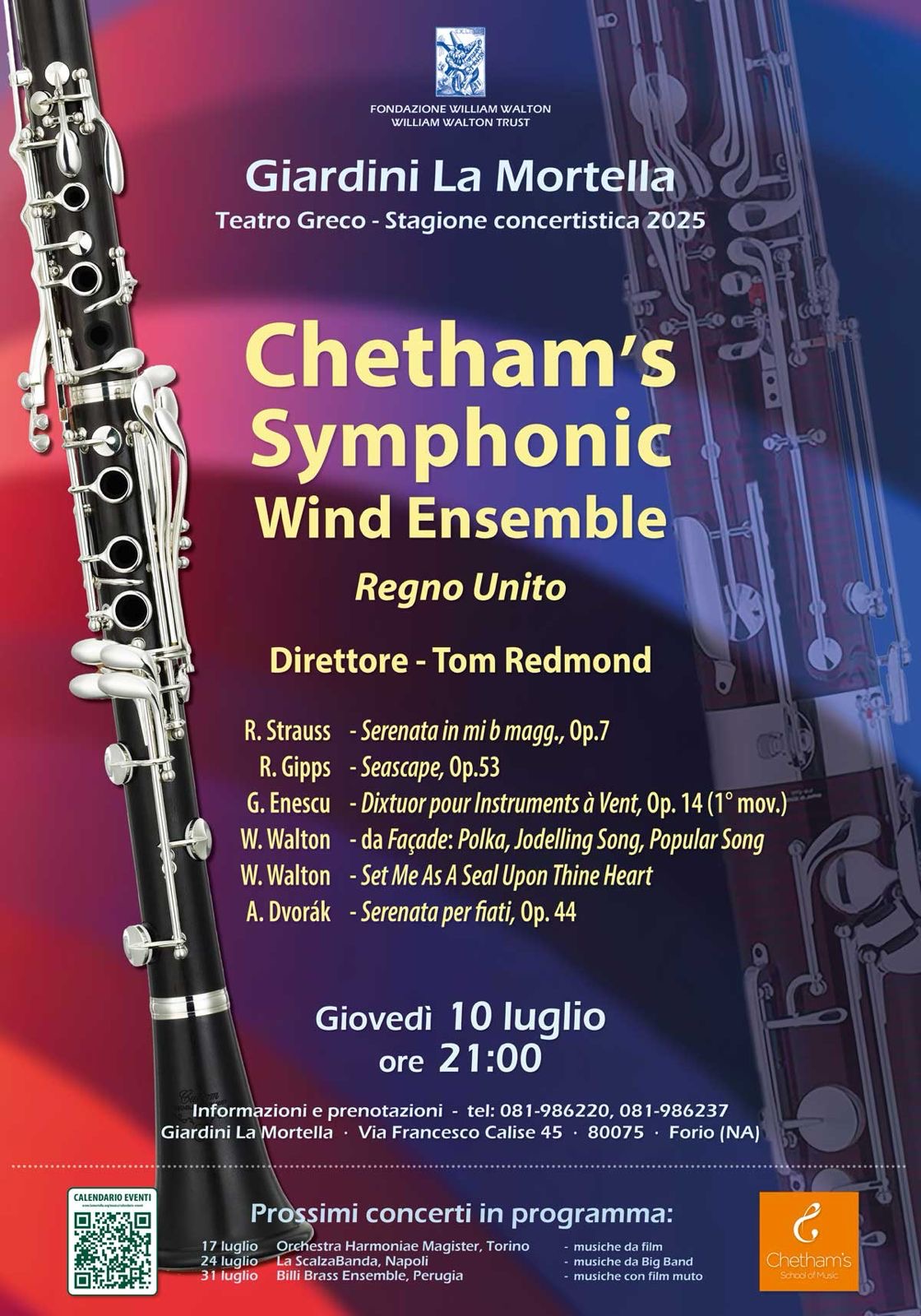 Giovedì 10 luglio, al Teatro Greco dei Giardini La Mortella di Forio sull'isola d'Ischia si esibirà in concerto la Chetam's Synphonic Wind Orchestra di Manchester, fondata nel 1563 e sostenuta dalla Fondazione Walton. La formazione di fiati proporrà un interessante programma, eseguendo in particolare la Serenata op.7 di Dvorak per fiati, violoncello e contrabasso del 1878 e una trasposizione per fiati del brano corale di Walton "Set me as a sealupon thine heart".